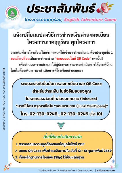 จากเดิมที่ทางโรงเรียน ได้แจ้งกำหนดให้เข้ามา ชำระเงิน ณ ห้องประชุมชั้น 1 ขอแจ้งเปลี่ยนเป็นการชำระผ่าน “ระบบออนไลน์ QR Code” เท่านั้น!! เพื่ออำนวยความสะดวก ให้ผู้ปกครองสามารถดำเนินการได้จากที่บ้าน โดยไม่ต้องเดินทางมาดำเนินการที่โรงเรียนด้วยตนเอง